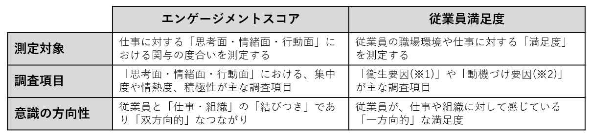 エンゲージメントスコアと並んで、引き合いに出される数値が「従業員満足度」です。ふたつの数値は、どう違うのでしょうか。両者の違いを表にまとめました。